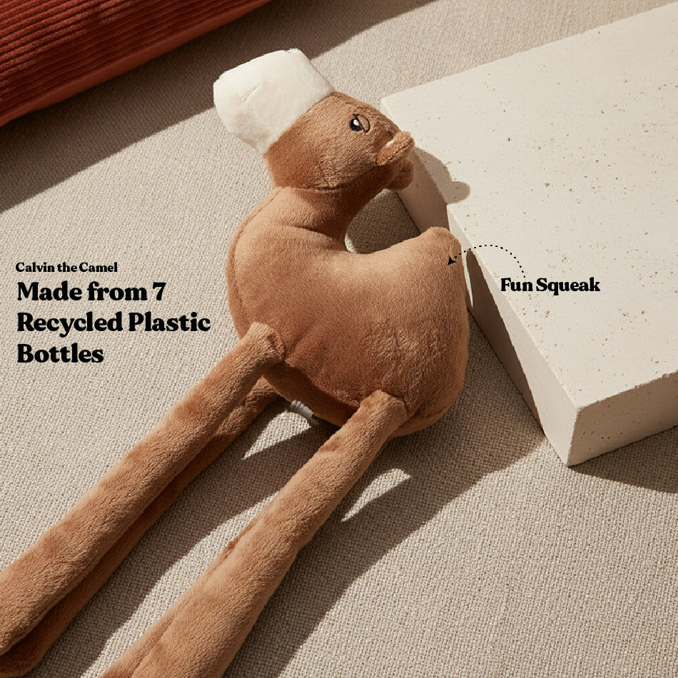 Calvin the Camel is the quirky companion your pup needs! With a squeaker and wiggly dangly legs, Calvin brings tons of fun to playtime. Made from 100% recycled plastic, he's a lovable and eco-friendly playmate.