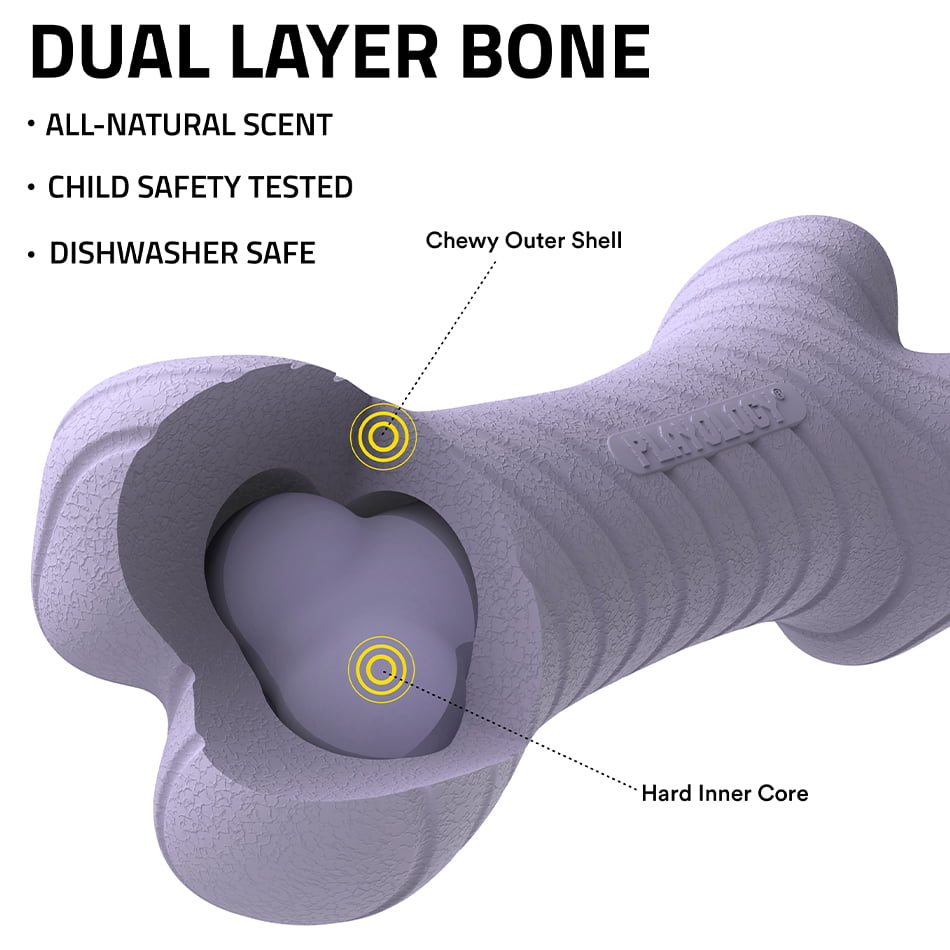 Your dog will love the enticing all-natural scent embedded in this Playology Dual Layer Bone. Fresh bursts of scent are released with every chew, keeping your dog engaged 7x longer than with unscented toys. With a chewy outer shell and a tough inner core, this toy is built to handle every chew and chomps your dog throws at it!